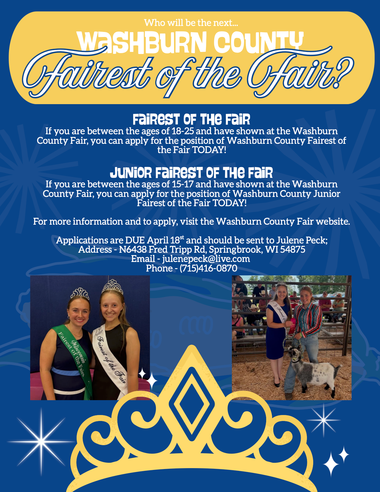 The Washburn County Fairest of the Fair contest is a royalty program for youth of at least 18 years of age, who have previously exhibited at the Washburn County Fair. The Fairest of the Fair is an ambassador of the Washburn County Fair and reigns during the year that they are crowned. The Fairest of the Fair may also enter the State Fairest of the Fair competition if she so wishes.